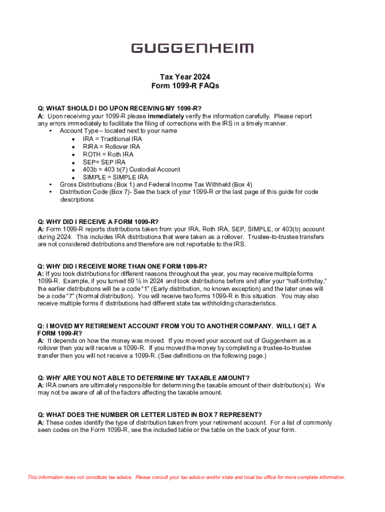 Tax Year 2024 Form 1099R FAQs Q: WHAT SHOULD I DO UPON RECEIVING MY 1099R? A: Upon receiving your 1099R please immediately verify the information carefully. Please report any errors immediately to