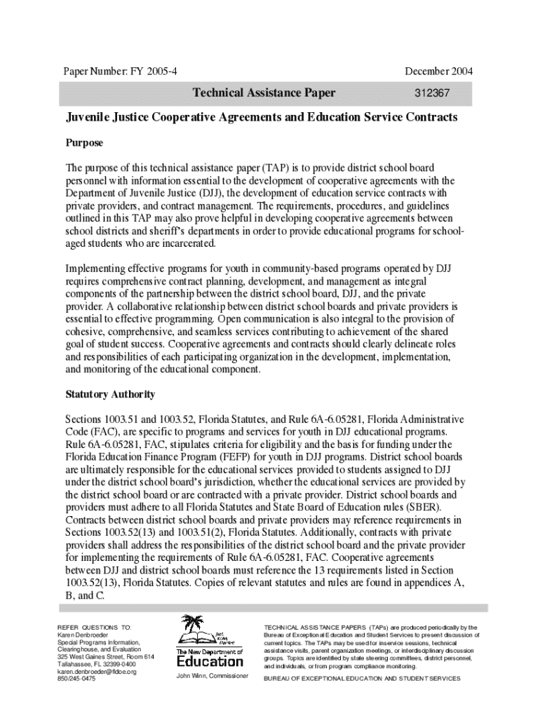 This technical assistance paper (TAP) provides district school board personnel with essential information for developing cooperative agreements with the Department of Juvenile Justice (DJJ), creating education service contracts with private providers, and managing those contracts. It outlines requirements, procedures, and guidelines aimed at supporting educational programs for incarcerated youth, emphasizing collaboration between district school boards, DJJ, and private organizations to...