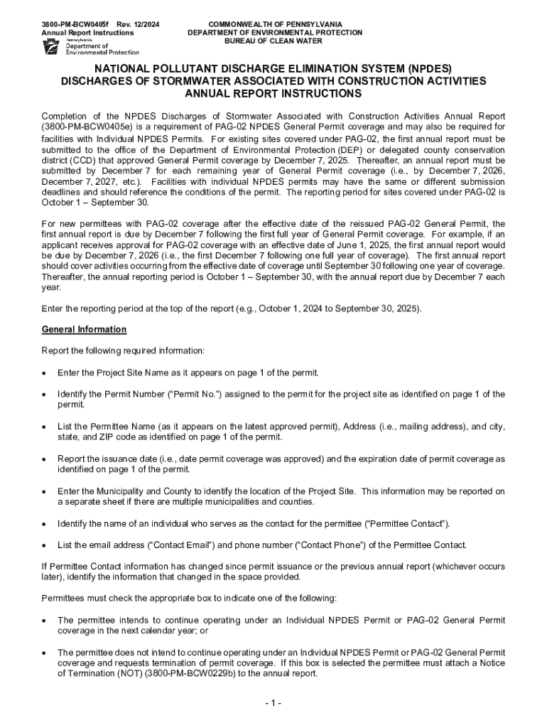 3800PMBCW0405f Rev. 12/2024 Annual Report InstructionsCOMMONWEALTH OF PENNSYLVANIA DEPARTMENT OF ENVIRONMENTAL PROTECTION BUREAU OF CLEAN WATERNATIONAL POLLUTANT DISCHARGE ELIMINATION SYSTEM (NPDES)