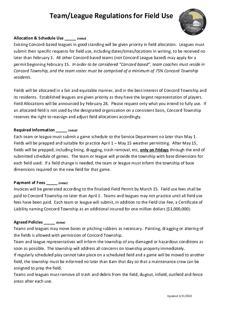 Team/League Regulations for Field Use Allocation & Schedule Use ___ (initial) Existing Concordbased leagues in good standing will be given priority in field allocation. Leagues must submit their specific