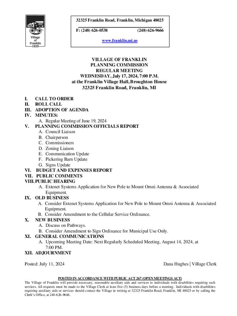 32325 Franklin Road, Franklin, Michigan 48025F: (248) 6260538(248) 6269666www.franklin.mi.usVILLAGE OF FRANKLIN PLANNING COMMISSION REGULAR MEETING WEDNESDAY, July 17, 2024, 7:00 P.M. at the Franklin
