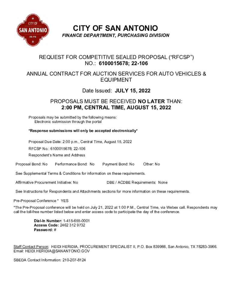 CITY OF SAN ANTONIOFINANCE DEPARTMENT, PURCHASING DIVISIONREQUEST FOR COMPETITIVE SEALED PROPOSAL (RFCSP) NO.: 6100015678; 22106 ANNUAL CONTRACT FOR AUCTION SERVICES FOR AUTO VEHICLES & EQUIPMENT