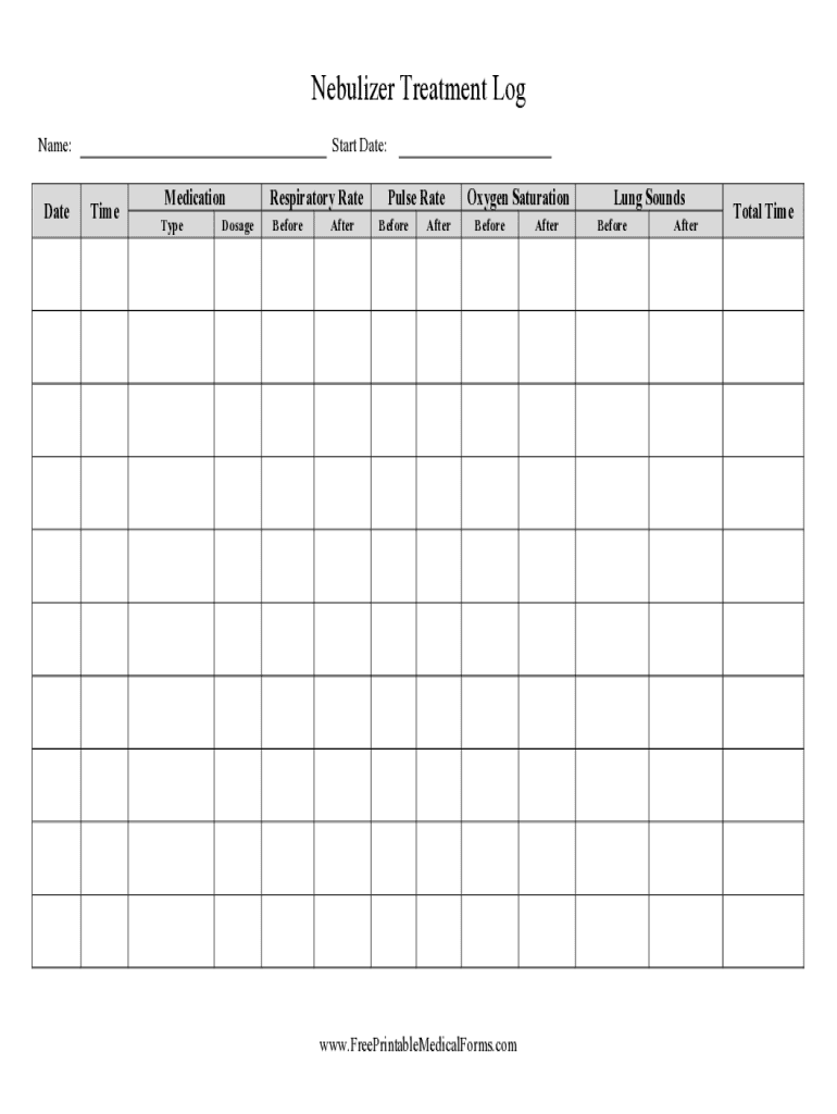 Nebulizer Treatment Log Name: DateStart Date: TimeMedication TypeDosageRespiratory Rate BeforeAfterPulse Rate BeforeAfterOxygen Saturation Beforewww.FreePrintableMedicalForms.comAfterLung Sounds BeforeAfterTotal