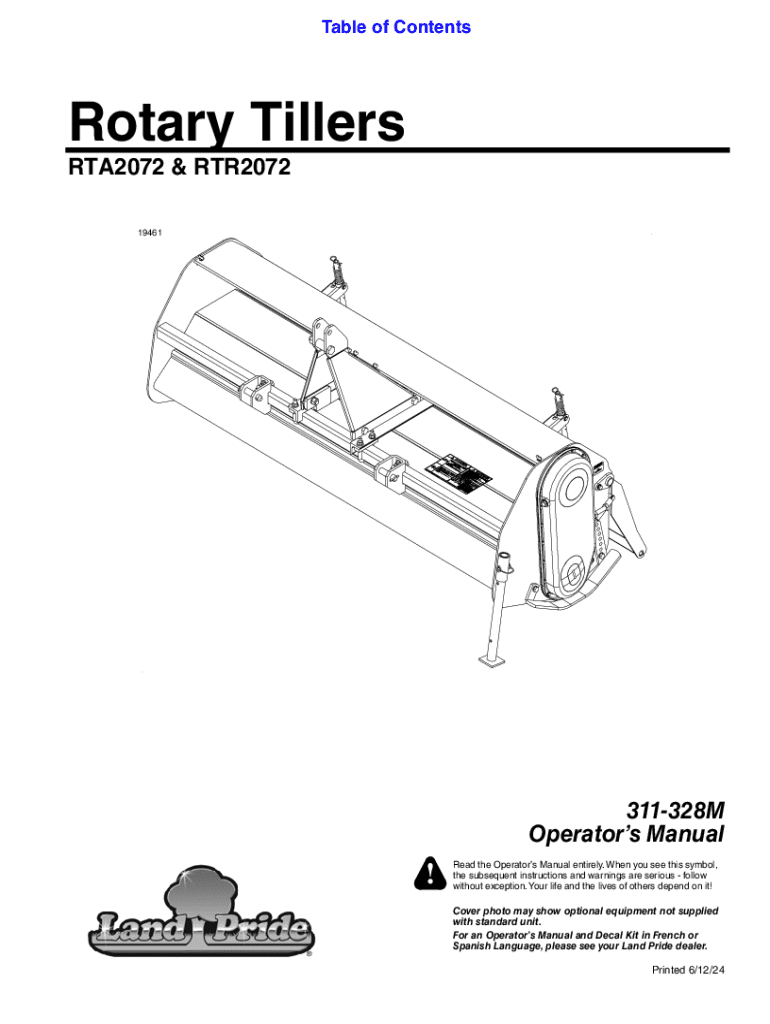 Table of ContentsRotary Tillers RTA2072 & RTR2072 19461311328M Operators Manual!Read the Operators Manual entirely. When you see this symbol, the subsequent instructions and warnings are serious follow