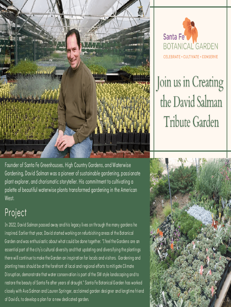 Founder of Santa Fe Greenhouses, High Country Gardens, and Waterwise Gardening, David Salman was a pioneer of sustainable gardening, passionate plant explorer, and charismatic storyteller. His commitment
