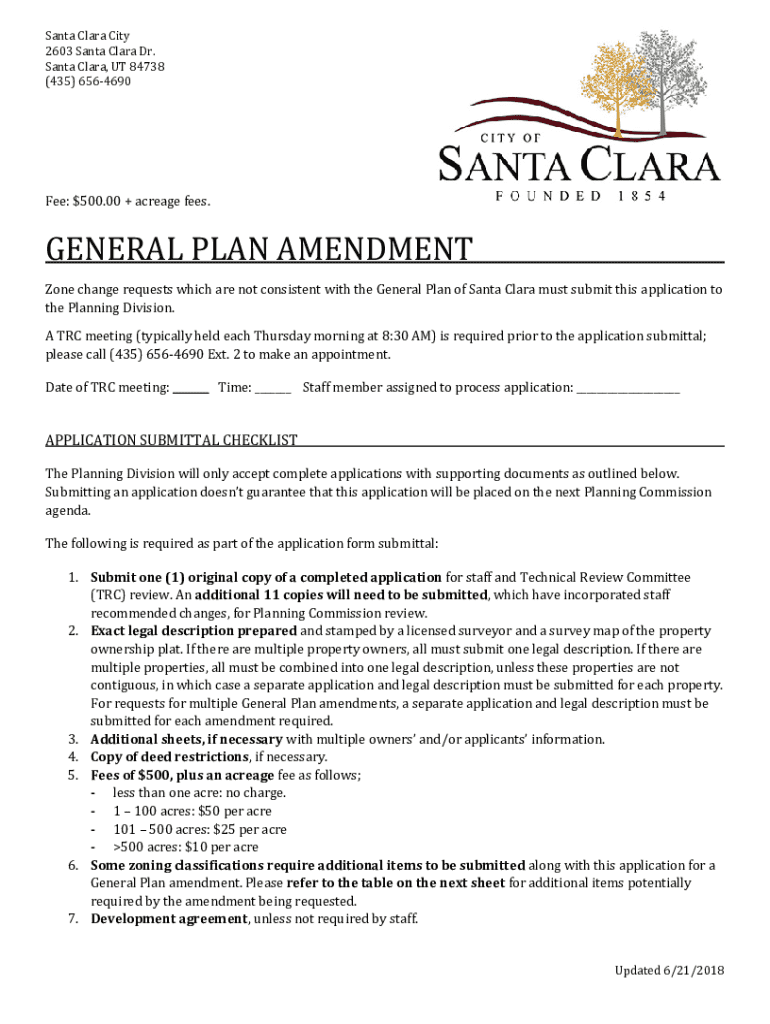 This document outlines the application process for a General Plan Amendment in Santa Clara City, including application requirements, fees, and the subsequent approval process by city authorities.
