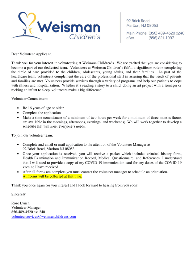 This document serves as an application for high school students interested in volunteering at Weisman Children’s Rehabilitation Hospital. It outlines the responsibilities, commitments, and requirements for applicants, as well as the application process and forms needed to join the volunteer team.