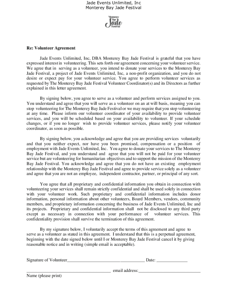 Get the free Re: Volunteer Agreement Jade Events Unlimited, Inc, DBA ...