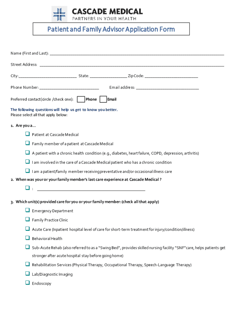 PATIENT AND FAMILY ADVISORY COUNCIL APPLICATION Thank you for your interest in joining Cascade Medicals Patient & Family Advisory Council (PFAC). The council will have an active role improving patient