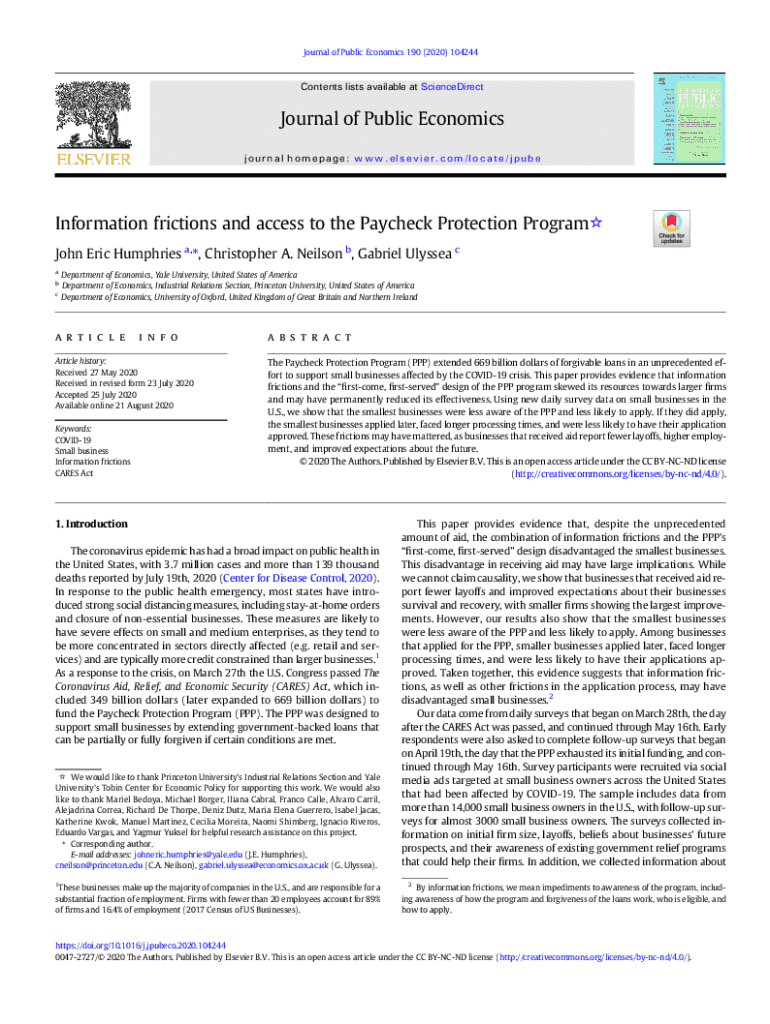 This paper provides evidence that information frictions and the \'first-come, first-served\' design of the PPP program skewed its resources towards larger firms and may have permanently reduced its effectiveness. Using daily survey data on small businesses in the U.S., the study shows that the smallest businesses were less aware of the PPP, less likely to apply, and faced longer processing times. The findings suggest that these frictions disadvantaged small businesses, leading to fewer...