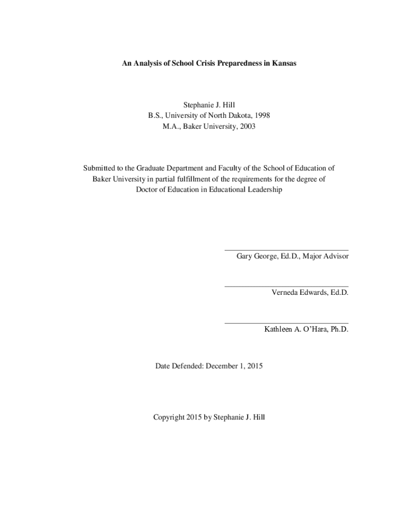 An Analysis of School Crisis Preparedness in KansasStephanie J. Hill B.S., University of North Dakota, 1998 M.A., Baker University, 2003Submitted to the Graduate Department and Faculty of the School