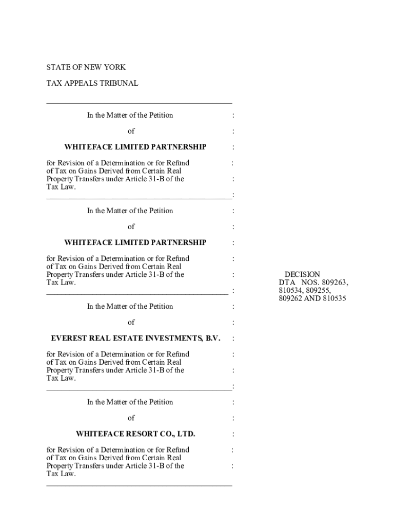 This document presents the decision of the New York State Tax Appeals Tribunal regarding petitions filed by Whiteface Limited Partnership, Everest Real Estate Investments, B.V., Whiteface Resort Co., Ltd., and 101430 Canada, Inc. The tribunal addressed issues surrounding the determination and refund of real property gains tax related to the liquidation and acquisition of partnership interests in Whiteface Limited Partnership. It analyzes the tax implications based on relevant provisions of...