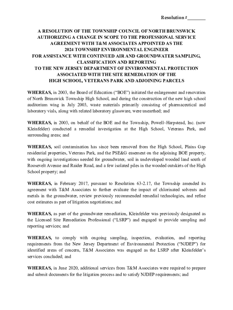 Resolution #___ A RESOLUTION OF THE TOWNSHIP COUNCIL OF NORTH BRUNSWICK AUTHORIZING A CHANGE IN SCOPE TO THE PROFESSIONAL SERVICE AGREEMENT WITH T&M ASSOCIATES APPOINTED AS THE 2024 TOWNSHIP ENVIRONMENTAL