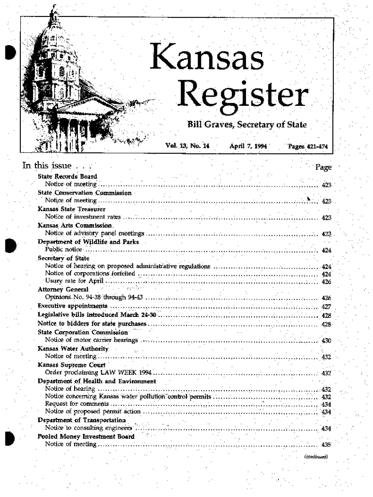 Kansas , Bill Graves, Secretary of State VoL 13, No.In this issue . .Noticeofmeeting.of7 199aPages,t2l474 rage........$tate ConservaHon Commission \' Notice of meeting . Kansas State Treisurer Notice