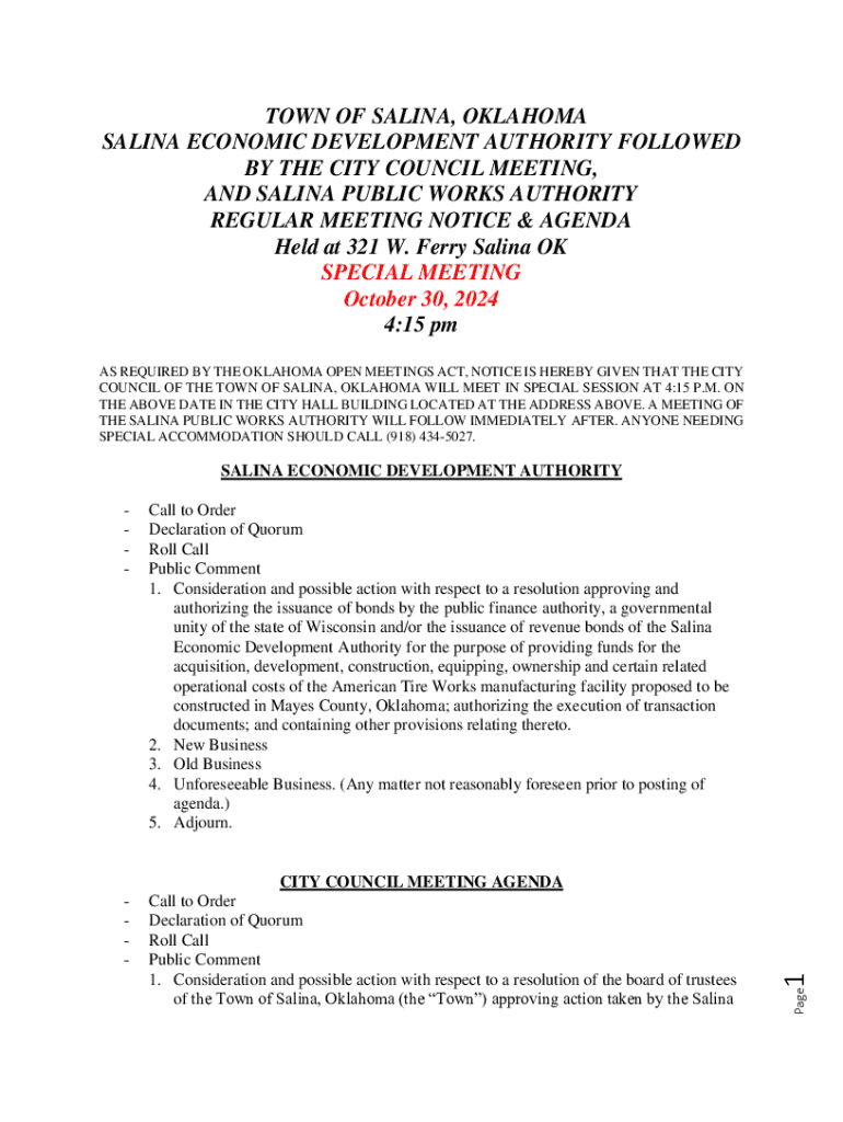 This document provides the agenda and notice for a special meeting of the Salina Economic Development Authority, City Council, and Public Works Authority in Salina, Oklahoma, scheduled for October 30, 2024. It outlines the meeting details, agenda topics including public comments, resolutions, approvals, and other business matters.