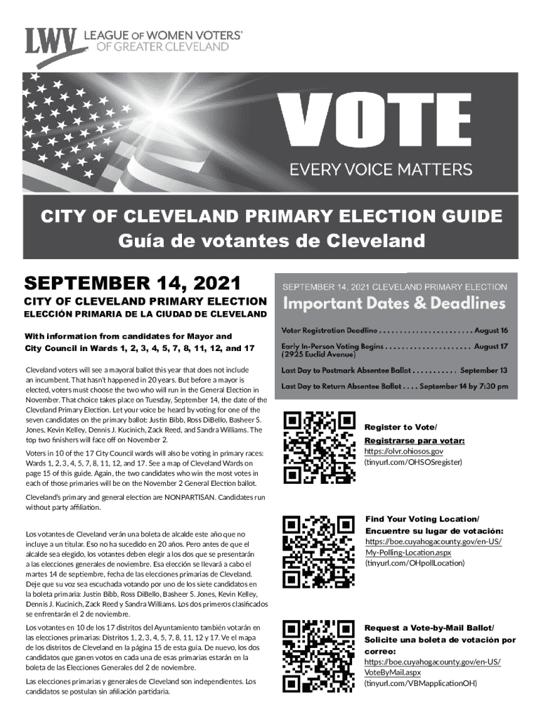CITY OF CLEVELAND PRIMARY ELECTION GUIDEGua de votantes de ClevelandSEPTEMBER 14, 2021CITY OF CLEVELAND PRIMARY ELECTION ELECCIN PRIMARIA DE LA CIUDAD DE CLEVELAND With information from candidates