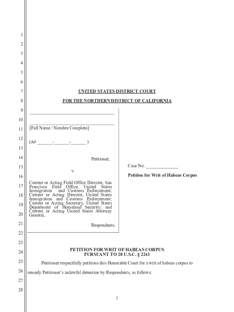 1 2 3 4 5 6 7UNITED STATES DISTRICT COURT8FOR THE NORTHERN DISTRICT OF CALIFORNIA9 10 11 12___ ___ [Full Name / Nombre Completo] (A# _________ )13 14 15Petitioner, Case No. ___v.Petition for Writ