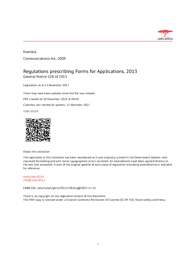 Namibia Communications Act, 2009Regulations prescribing Forms for Applications, 2013 General Notice 328 of 2013 Legislation as at 15 November 2017 There may have been updates since this le was created.