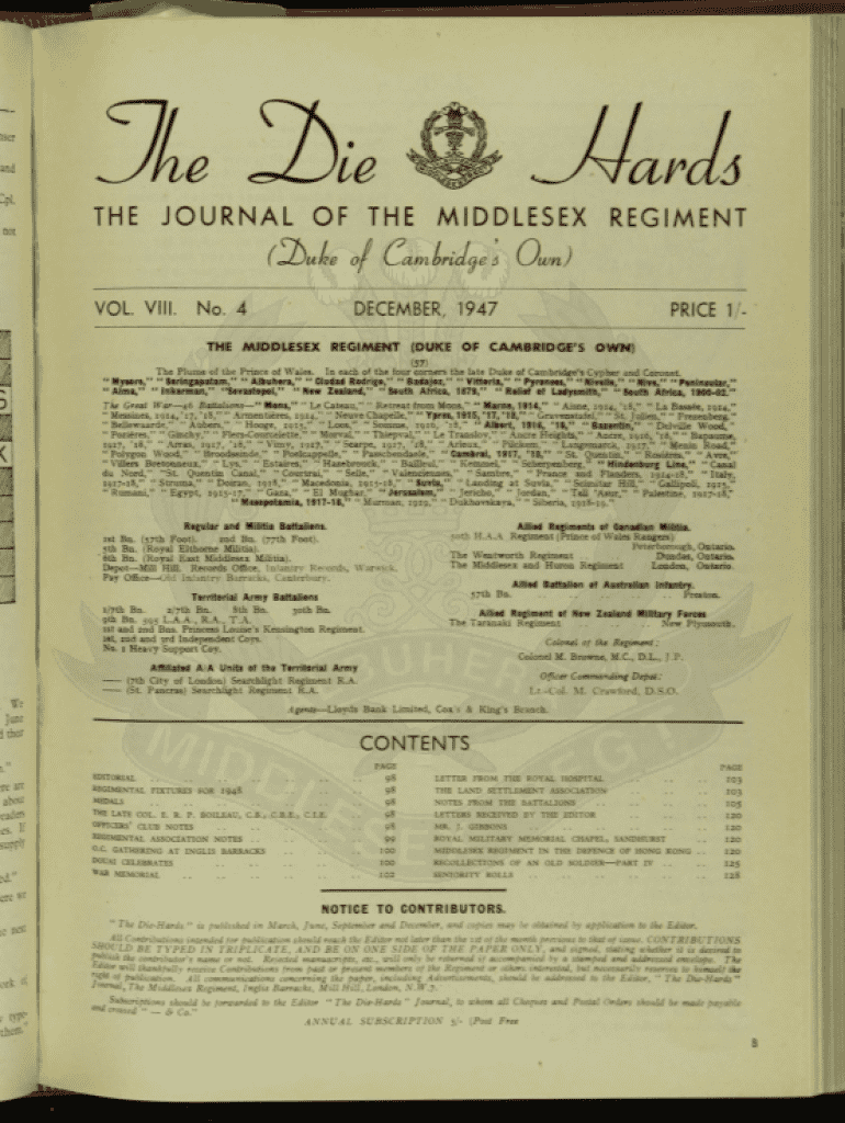 This document contains the December 1947 issue of The Die-Hards Journal, which includes articles on the history and activities of the Middlesex Regiment, including recollections from old soldiers, reports on military engagements, updates on regimental events and activities, as well as a record of the officers and members of the Middlesex Regiment.