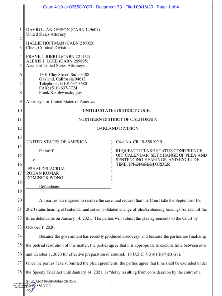 Case 4:19cr00558YGR Document 73 Filed 09/16/20 Page 1 of 41 DAVID L. ANDERSON (CABN 149604) United States Attorney 2 HALLIE HOFFMAN (CABN 210020) 3 Chief, Criminal Division 4 FRANK J. RIEBLI (CABN