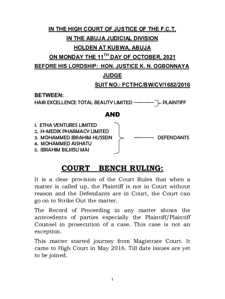 IN THE HIGH COURT OF JUSTICE OF THE F.C.T. IN THE ABUJA JUDICIAL DIVISION HOLDEN AT KUBWA, ABUJA ON MONDAY THE 11TH DAY OF OCTOBER, 2021 BEFORE HIS LORDSHIP: HON. JUSTICE K. N. OGBONNAYAJUDGE SUIT