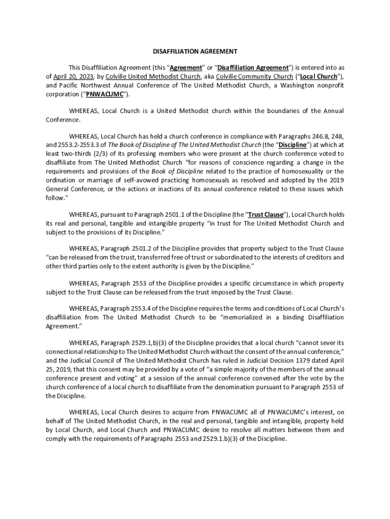 This Disaffiliation Agreement sets forth the terms and conditions under which Colville United Methodist Church disaffiliates from The United Methodist Church, including obligations related to property, financial considerations, and compliance with church governance standards as outlined in the United Methodist Church\'s Book of Discipline.