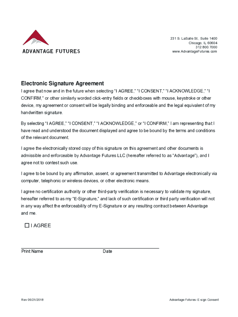 TRADE UP TO ADVANTAGE FUTURESClient Account Application Individual (US) Welcome to the Advantage Futures Account Application. This account application requires the use of electronic signatures. If