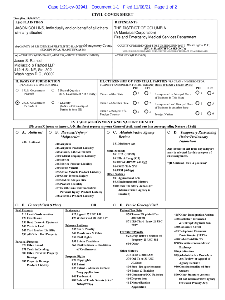 This document is a collective action complaint filed by Jason Collins against the District of Columbia Fire and Emergency Medical Services Department for allegedly failing to pay overtime compensation as mandated by the Fair Labor Standards Act (FLSA). It details violations related to unpaid wages and seeks backpay, liquidated damages, and attorney’s fees due to non-compliance with wage regulation concerning hazard pay during the COVID-19 pandemic.