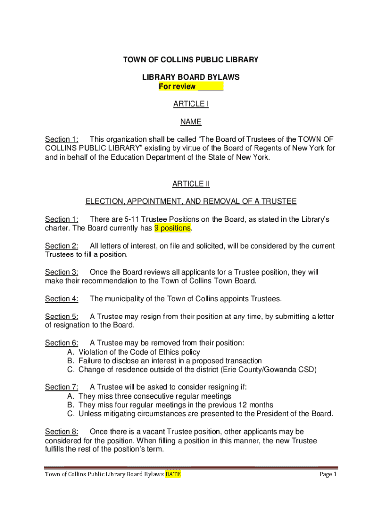 These bylaws outline the governance structure, responsibilities, and procedures for the Board of Trustees of the Town of Collins Public Library, detailing the election and appointment of trustees, the roles of officers, and policies regarding conflicts of interest and committee formations.