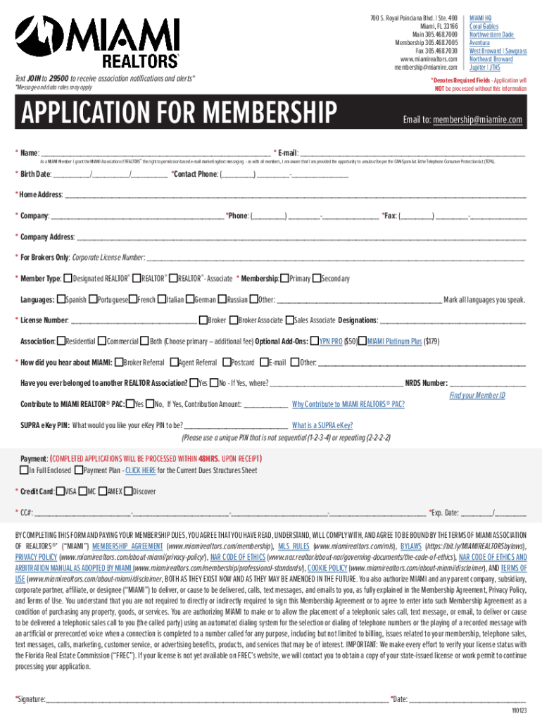 This document is an application form for individuals seeking membership with the MIAMI Association of REALTORS®. It requests personal and professional information necessary for processing the application, including contact details, type of membership, languages spoken, and payment information. The application also includes compliance acknowledgments and agreements regarding marketing communications.