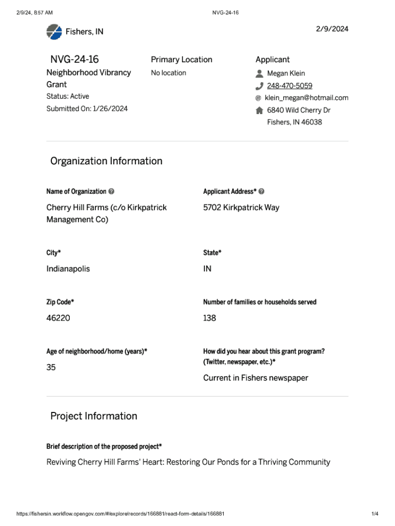 2/9/24, 8:57 AMNVG24162/9/2024,Fishers IN2416NVGPrimary LocationApplicantNo locationNeighborhood VibrancyMegan Klein 2484705059 klein_megan hotmail comGrantStatus Active Submitted On 1 26 2024 ::/@.6840