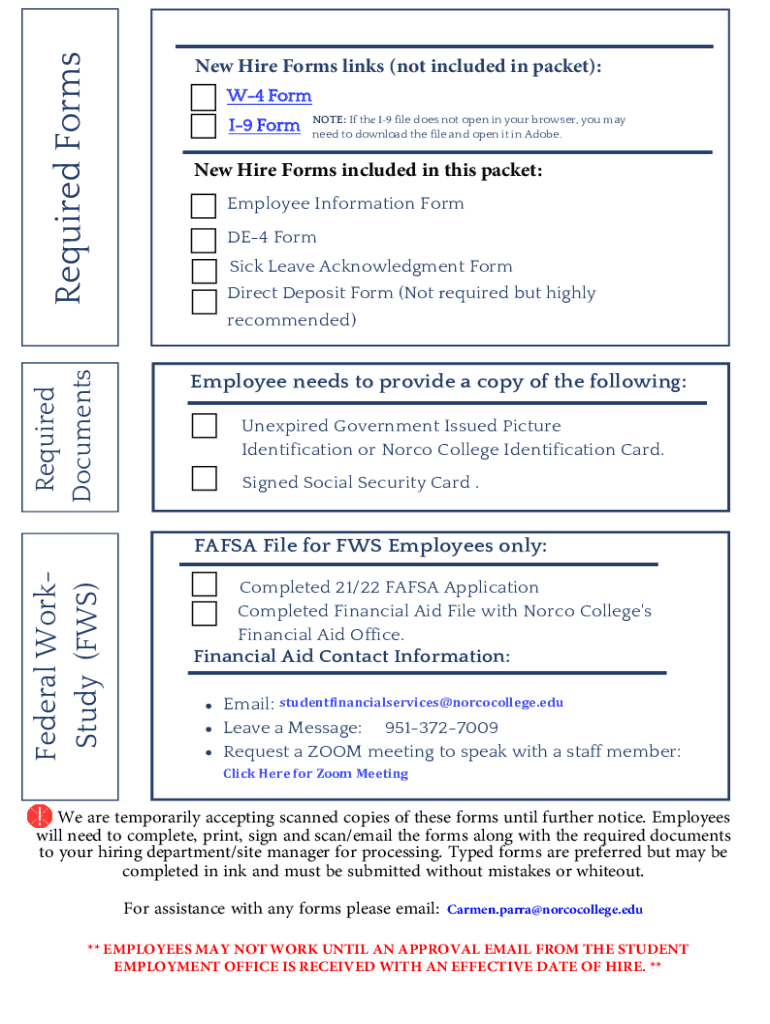 This document outlines the required and recommended forms for new hires at Norco College. It includes details on the W-4 and I-9 forms, employee information requirements, and eligibility criteria for student employment, as well as instructions for submission and adherence to rules and regulations during employment.