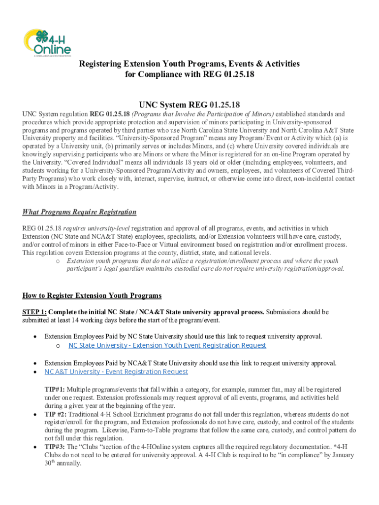This document outlines the regulations and procedures for registering youth programs, events, and activities that involve minors at North Carolina State University and North Carolina A&T State University. It details the approval process, requirements for compliance with youth safety, and the actions that must be taken before, during, and after the events to ensure the protection and supervision of minors.
