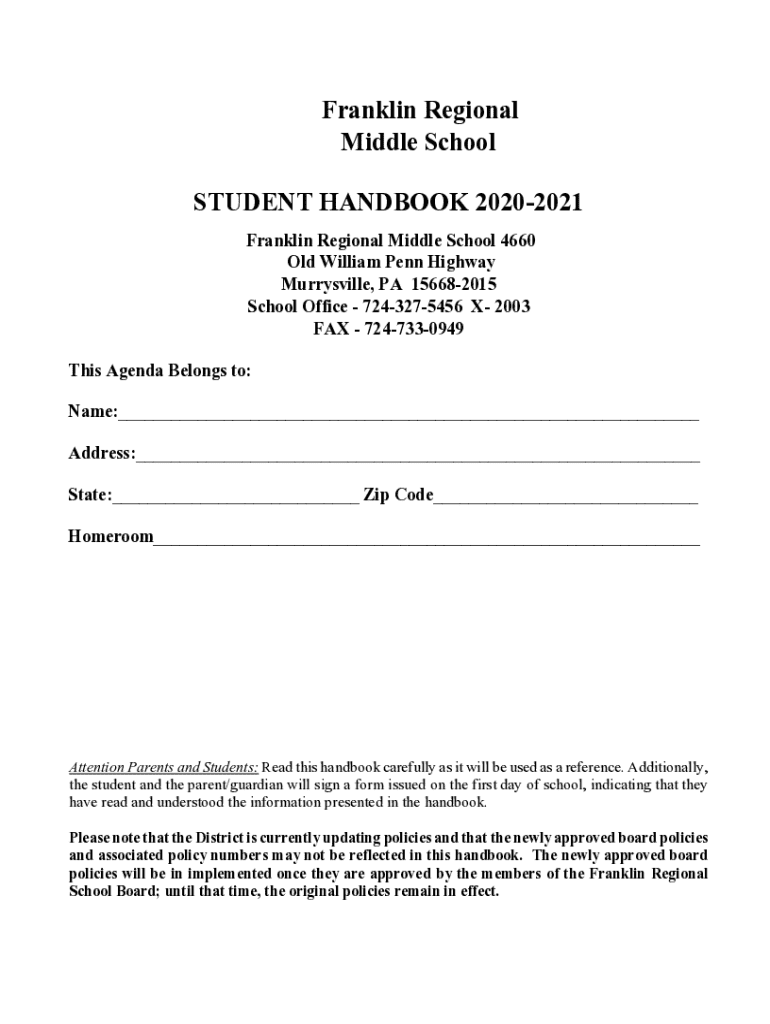 Franklin Regional Middle School STUDENT HANDBOOK 20202021 Franklin Regional Middle School 4660 Old William Penn Highway Murrysville, PA 156682015 School Office 7243275456 X 2003 FAX 7247330949 This