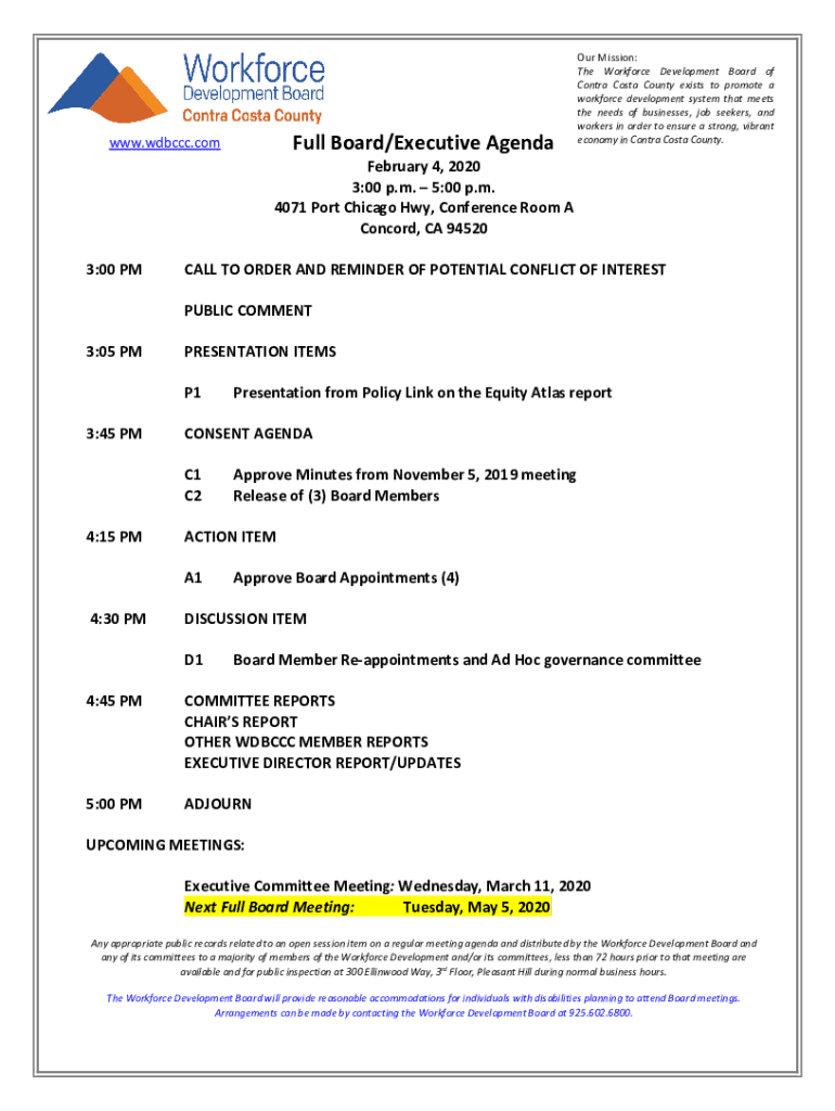 This document outlines the agenda for the Workforce Development Board of Contra Costa County meeting, including mission statements, scheduled topics for discussion, action items, and upcoming meetings. It reflects the board\'s efforts to engage with community and business needs to develop workforce initiatives in the region.