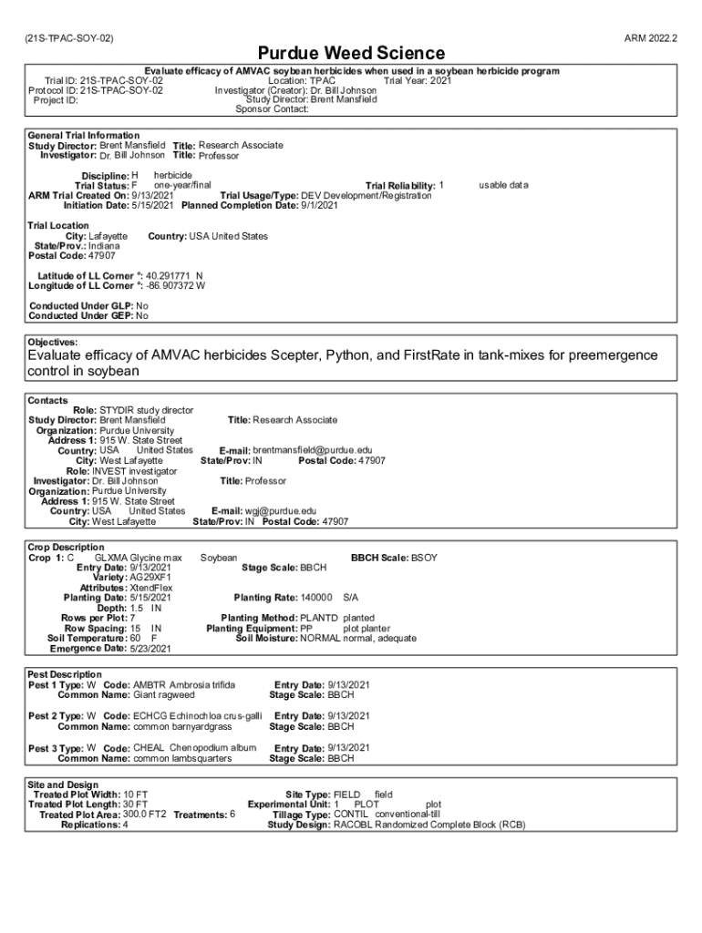 (21STPACSOY02)ARM 2022.2Purdue Weed ScienceEvaluate efficacy of AMVAC soybean herbicides when used in a soybean herbicide program Trial ID: 21STPACSOY02 Location: TPAC Trial Year: 2021 Protocol ID: