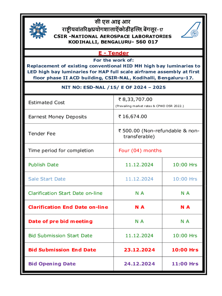 , 17 CSIR NATIONAL AEROSPACE LABORATORIES KODIHALLI, BENGALURU 560 017E Tender For the work of: Replacement of existing conventional HID MH high bay luminaries to LED high bay luminaries for HAP full