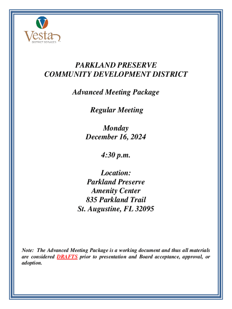 This document outlines the advanced meeting package for the Parkland Preserve Community Development District, detailing the agenda, reports, and proposals to be reviewed during the scheduled regular meeting on December 16, 2024, at the Parkland Preserve Amenity Center in St. Augustine, FL.