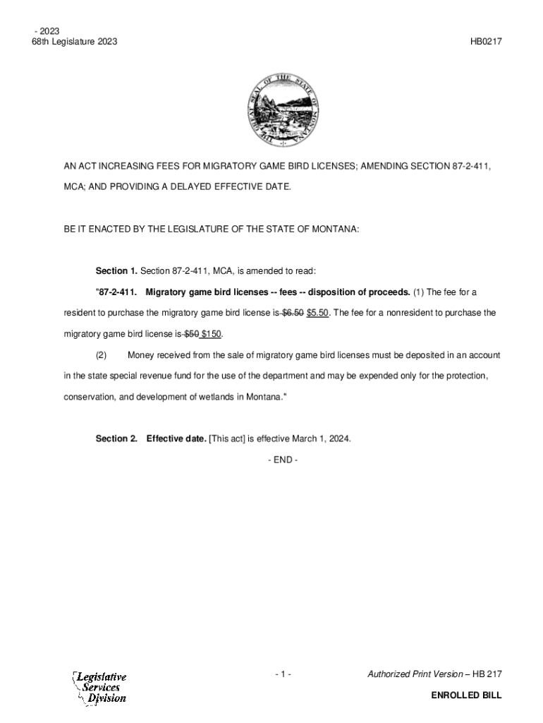 2023 68th Legislature 2023HB0217AN ACT INCREASING FEES FOR MIGRATORY GAME BIRD LICENSES; AMENDING SECTION 872411, MCA; AND PROVIDING A DELAYED EFFECTIVE DATE.BE IT ENACTED BY THE LEGISLATURE OF THE