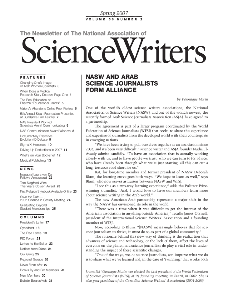 Spring 2007 V O L U M E5 6N U M B E R2The Newsletter of The National Association ofScienceWriters F E AT U R E S Changing Ones Image of Arab Women Scientists 3 When Does a Medical Research Story Deserve
