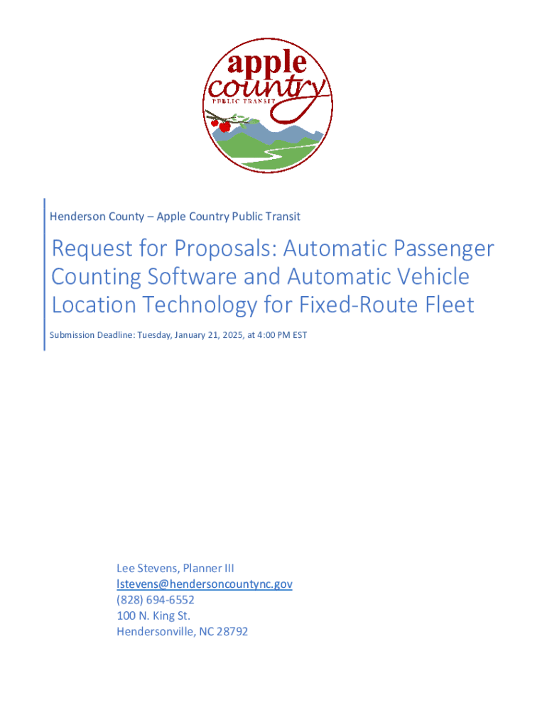 This document is a Request for Proposals (RFP) issued by Henderson County\'s Transit Division, seeking qualifying vendors to provide Automatic Passenger Counting (APC) analytics software and Automatic Vehicle Location (AVL) technology for its fixed-route fleet. The RFP outlines the project goals, scope of work, evaluation criteria, submission guidelines, and terms and conditions for participating vendors. Proposals are due by January 21, 2025.