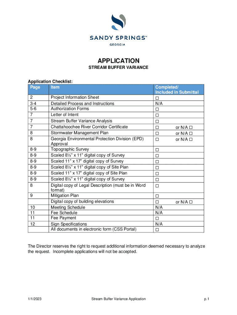 This document outlines the requirements and procedures for applying for a Stream Buffer Variance in Sandy Springs. It includes a detailed checklist of necessary items such as project information sheets, authorization forms, mitigation plans, and other relevant documents. The application must be complete and submitted through the CSS Portal. The document provides guidelines for pre-application meetings, filing deadlines, and requirements for approval from the Georgia Environmental Protection...