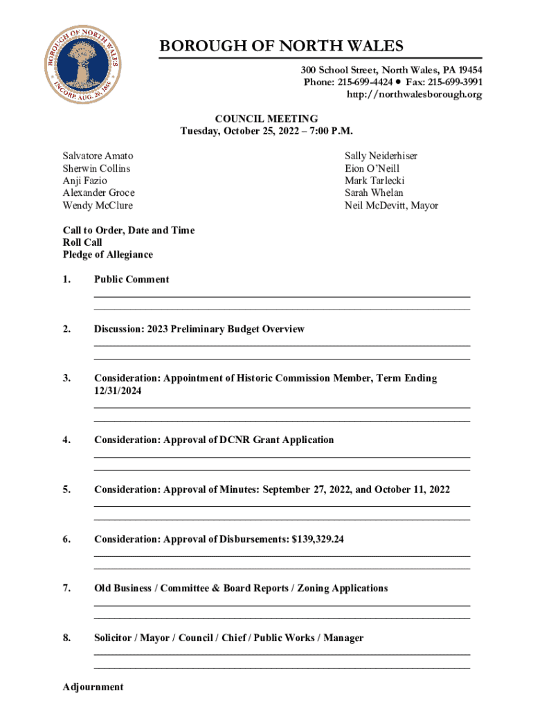 This document outlines the agenda and minutes for the North Wales Borough Council meeting held on October 25, 2022. It includes various considerations such as the 2023 Preliminary Budget Overview, public comments, and approvals for appointments and grant applications. The document also provides information about the council members, public participation details, and accommodations for individuals with disabilities.