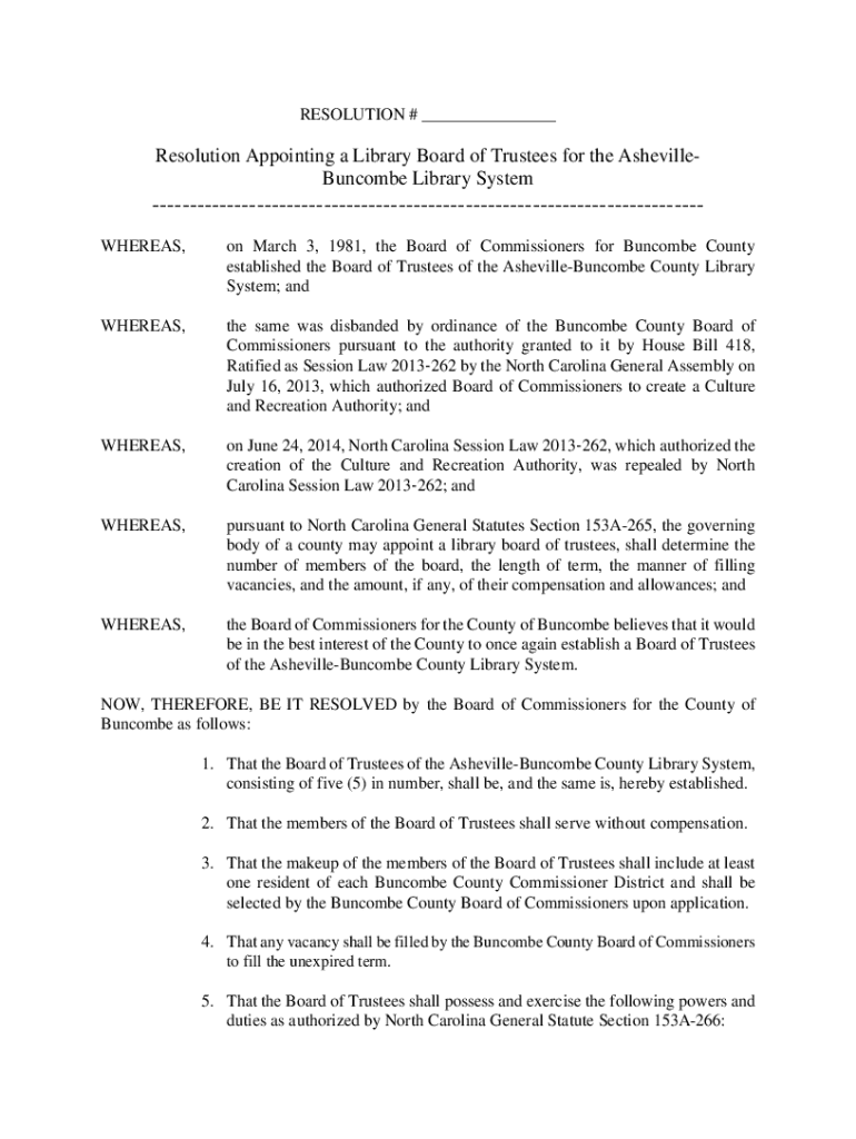 RESOLUTION # ___Resolution Appointing a Library Board of Trustees for the AshevilleBuncombe Library SystemWHEREAS,on March 3, 1981, the Board of Commissioners for Buncombe County established the Board