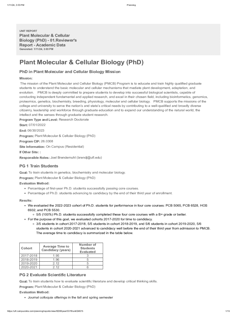 This report details the assessment and evaluation of the Plant Molecular and Cellular Biology (PMCB) PhD program for the academic years 2022-2023, highlighting program goals, student performance, publication metrics, professional development, and outcomes assessments.