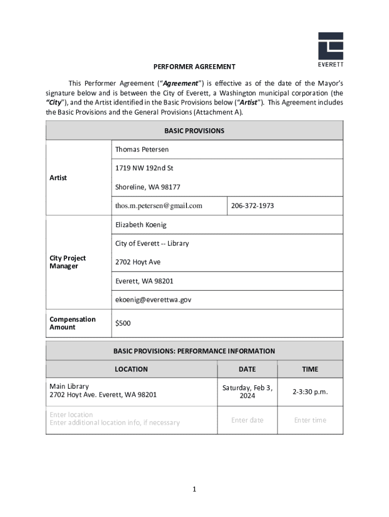PERFORMER AGREEMENT This Performer Agreement (Agreement) is effective as of the date of the Mayors signature below and is between the City of Everett, a Washington municipal corporation (the City),
