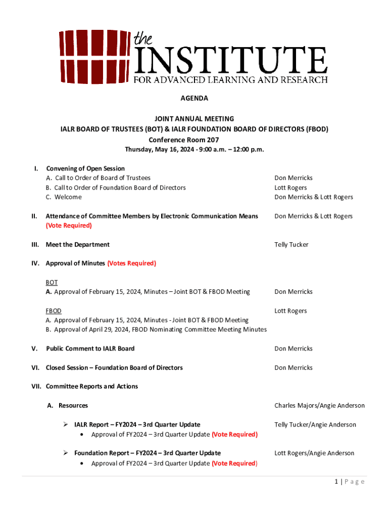 AGENDA JOINT ANNUAL MEETING IALR BOARD OF TRUSTEES (BOT) & IALR FOUNDATION BOARD OF DIRECTORS (FBOD) Conference Room 207 Thursday, May 16, 2024 9:00 a.m. 12:00 p.m.I.II.Convening of Open Session A.