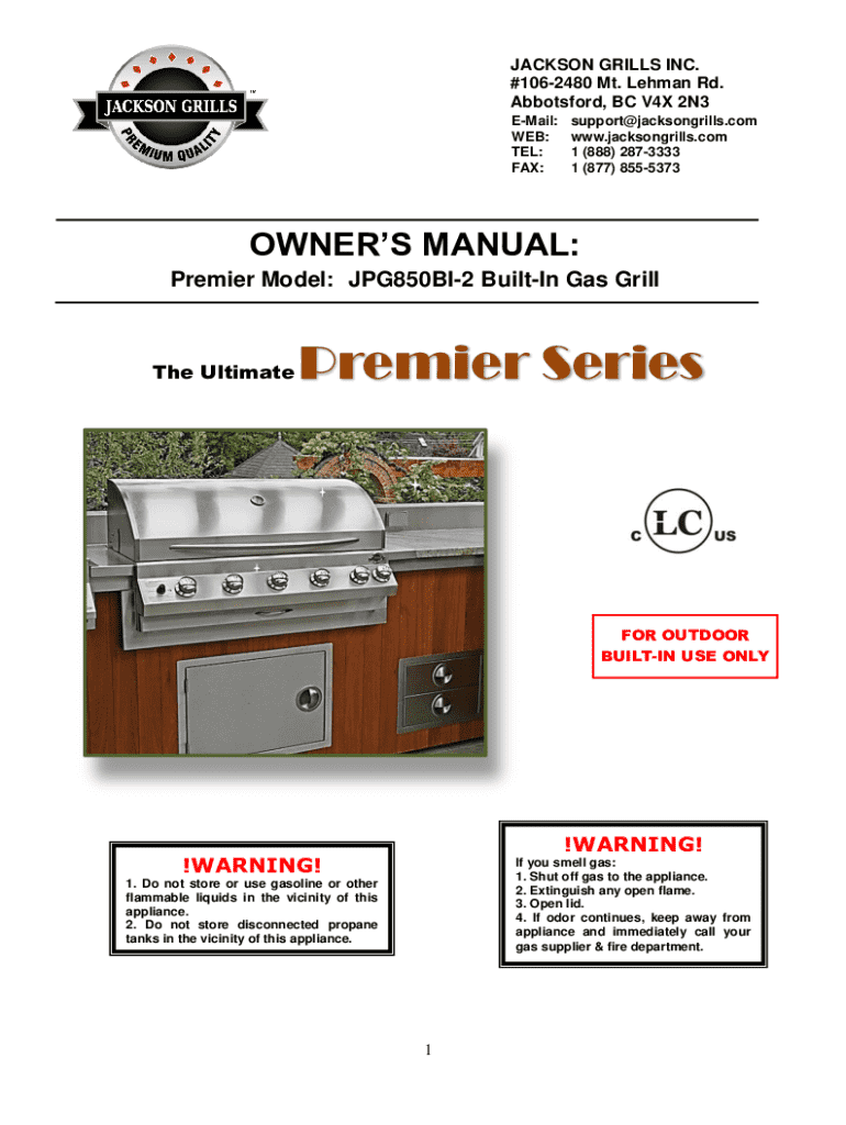 JACKSON GRILLS INC. #1062480 Mt. Lehman Rd. Abbotsford, BC V4X 2N3 EMail: WEB: TEL: FAX:support@jacksongrills.com www.jacksongrills.com 1 (888) 2873333 1 (877) 8555373OWNERS MANUAL: Premier Model: