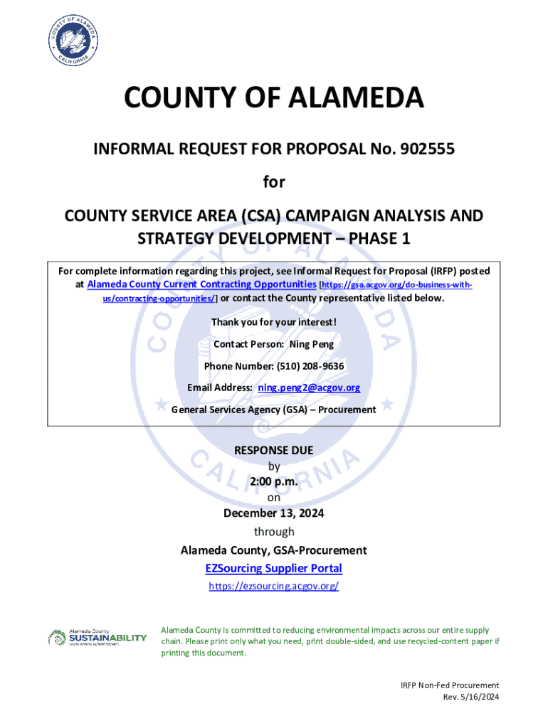This document outlines a request for proposals aimed at conducting a campaign analysis and strategy development for the County Service Area\'s lead abatement program. The selected contractor will assist the Alameda County Community Development Agency in understanding community awareness and support for a proposed ballot initiative. The document details the project scope, requirements, evaluation criteria, calendar of events, and submission instructions.