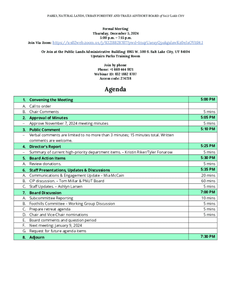 PARKS, NATURAL LANDS, URBAN FORESTRY AND TRAILS ADVISORY BOARD of SALT LAKE CITYFormal Meeting Thursday, December 5, 2024 5:00 p.m. 7:15 p.m.Join Via Zoom: https://us02web.zoom.us/j/83218828707?pwd1mqrUaeayQpakgalawKz0eJaOYiSl4.1
